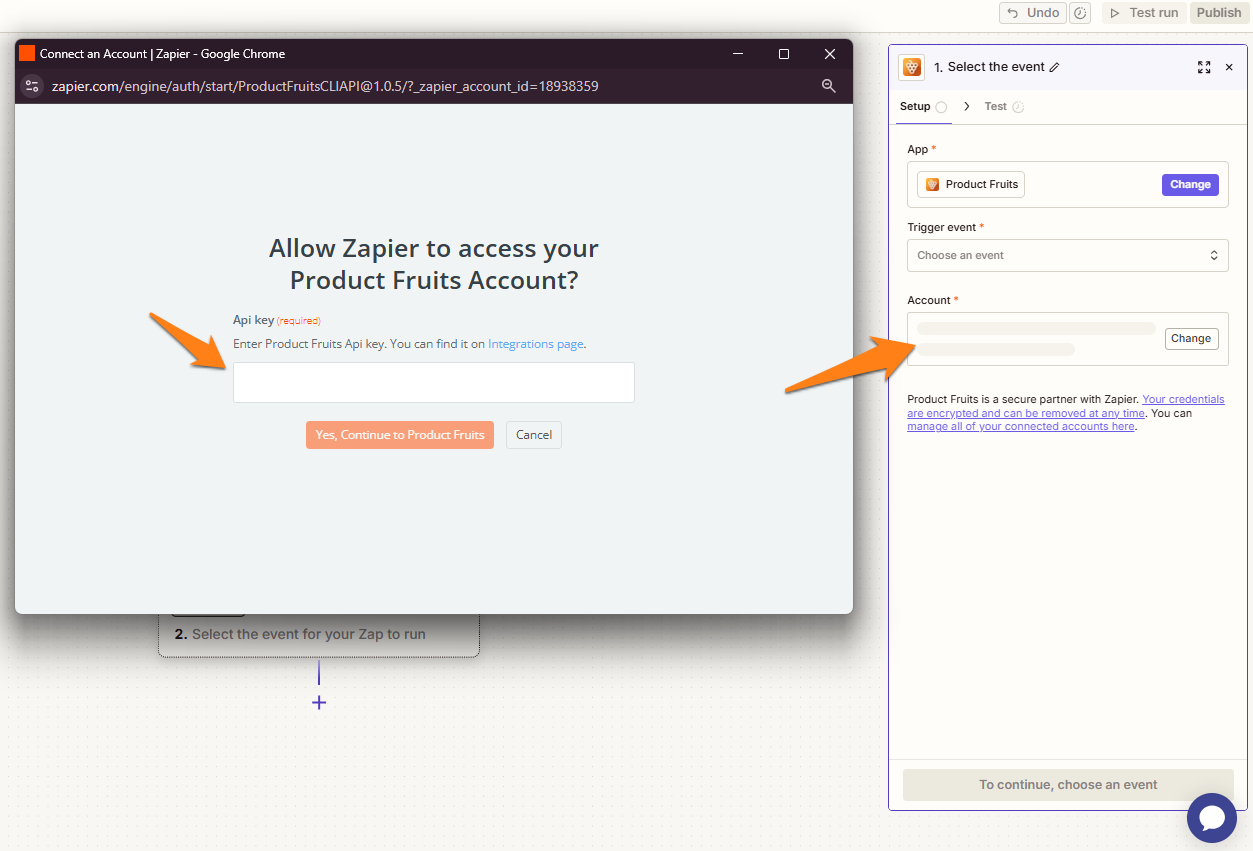 In Zapier, when you first choose the Product Fruits integration, click on Connect and use the generated API key.